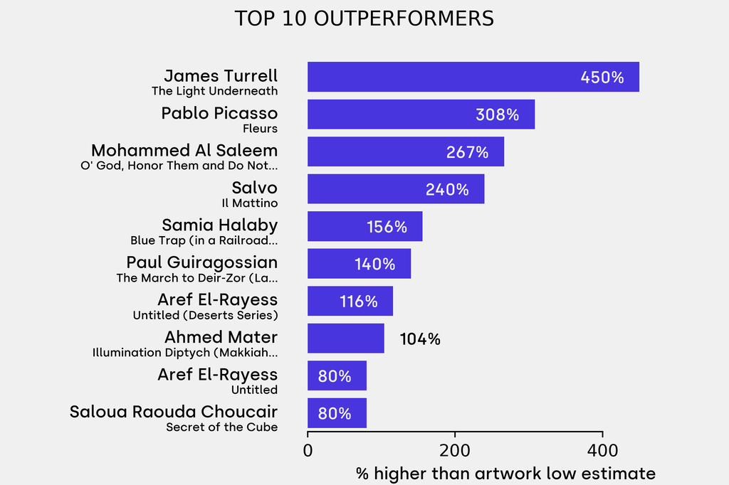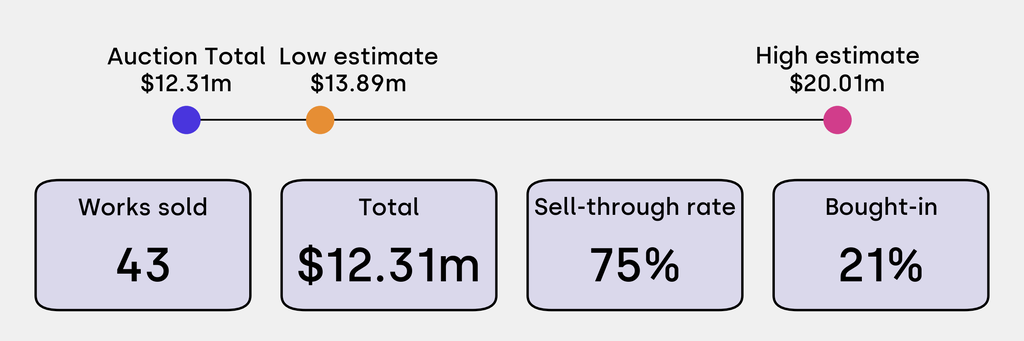 All results include the fees and premiums added to the price of a work of art when the auctioneer's hammer falls. Sale prices are compared to the auction house’s low estimate, which do not include premiums.