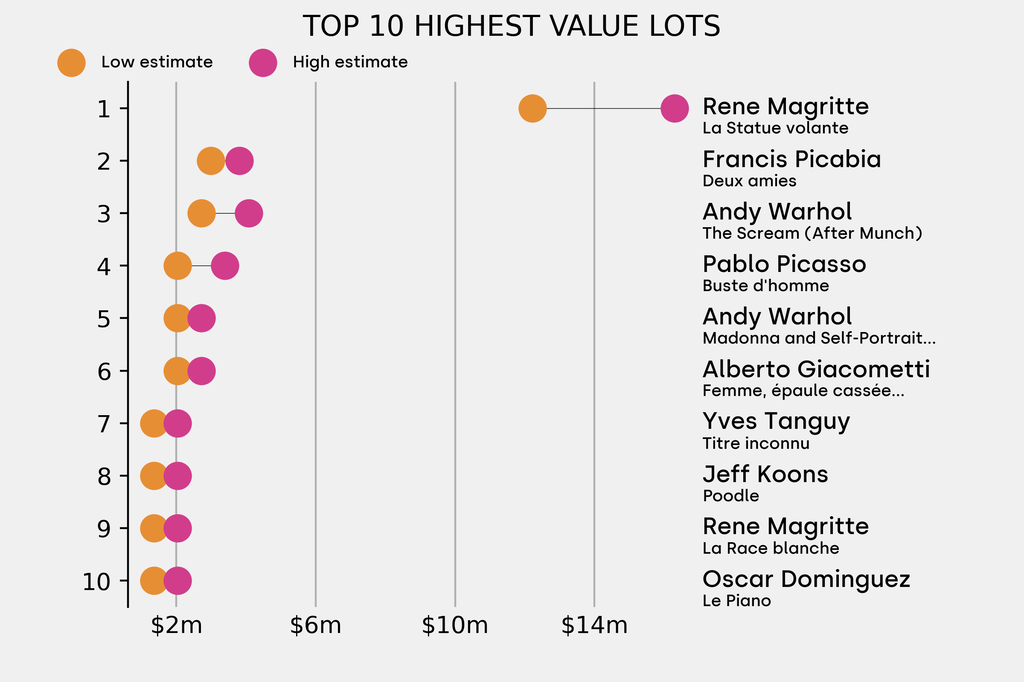 The highest-value lot announced is: Rene Magritte, La Statue volante (1958), which is estimated to sell for between $12.22m and $16.3m. The work is backed by a guarantee. It has been traded 3 times in the past.