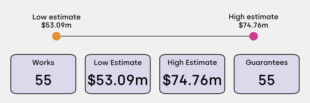 55 works are backed by guarantees, including: Francis Picabia, Deux amies (1940). It is estimated to sell for between $2.99m and $3.8m. It has been traded 6 times in the past.