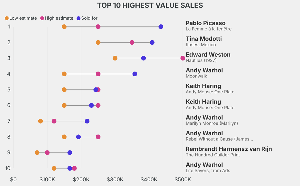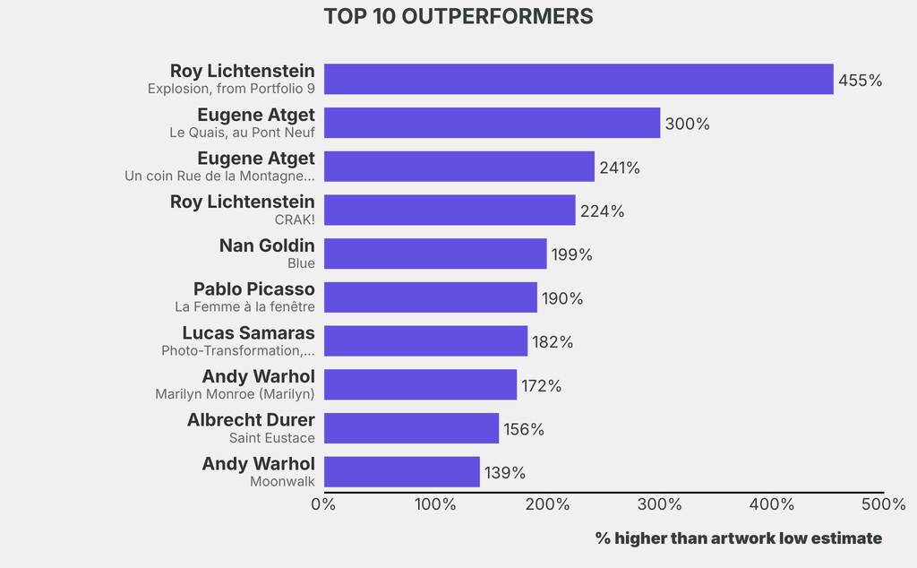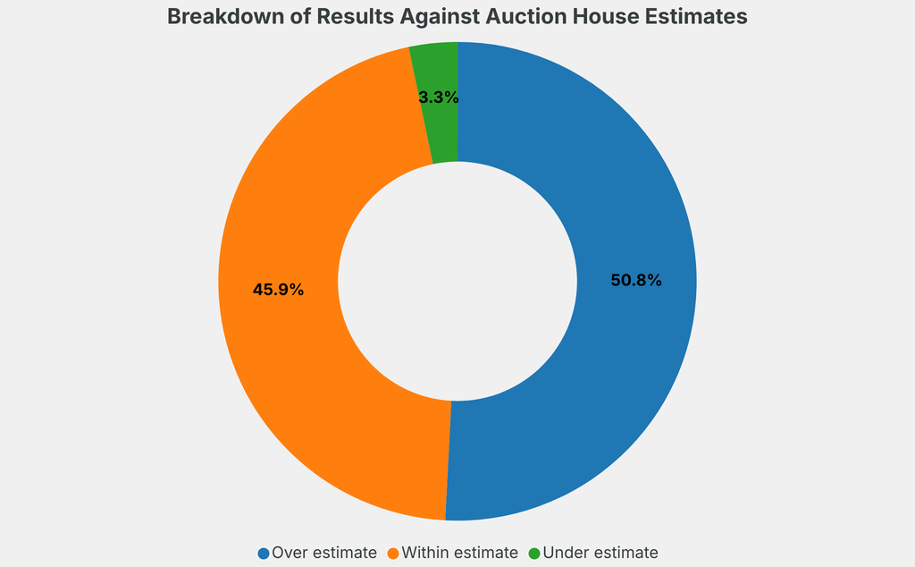 All results include the fees and premiums added to the price of a work of art when the auctioneer's hammer falls. Sale prices are compared to the auction house’s low estimate, which do not include premiums.