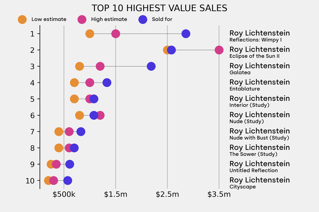 92 works were backed by guarantees, including: Roy Lichtenstein, Eclipse of the Sun II (1975). It sold for $2.58m, 3% above its $2.5m low estimate.. It has been traded once in the past.