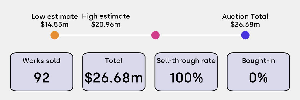 All results include the fees and premiums added to the price of a work of art when the auctioneer's hammer falls. Sale prices are compared to the auction house’s low estimate, which do not include premiums.