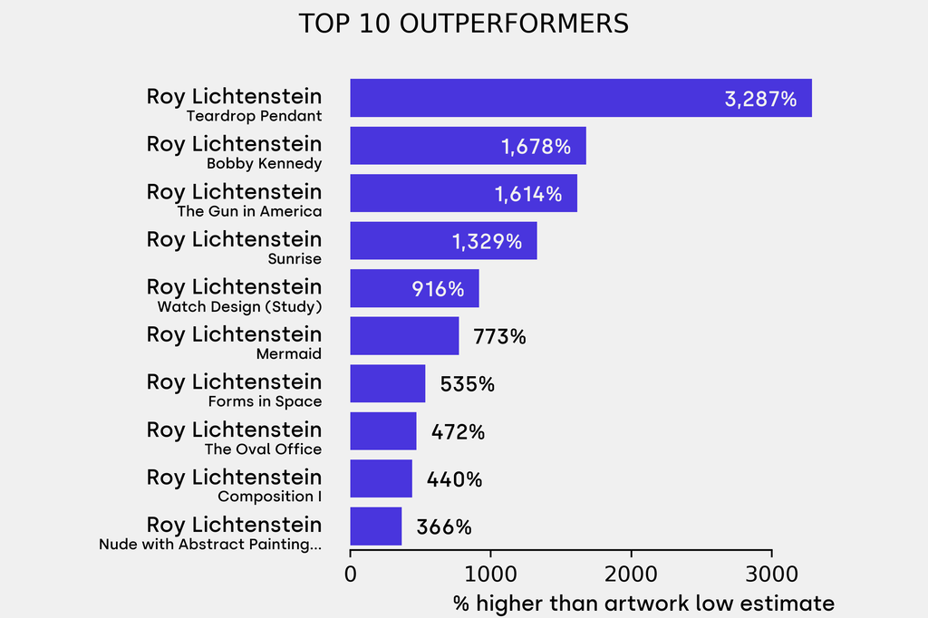 The outperformer sold for 3286% above its low estimate. Roy Lichtenstein, Teardrop Pendant (1966), sold for $101,600 ($3,000 low estimate). The work was backed by a guarantee. It has been traded once in the past.