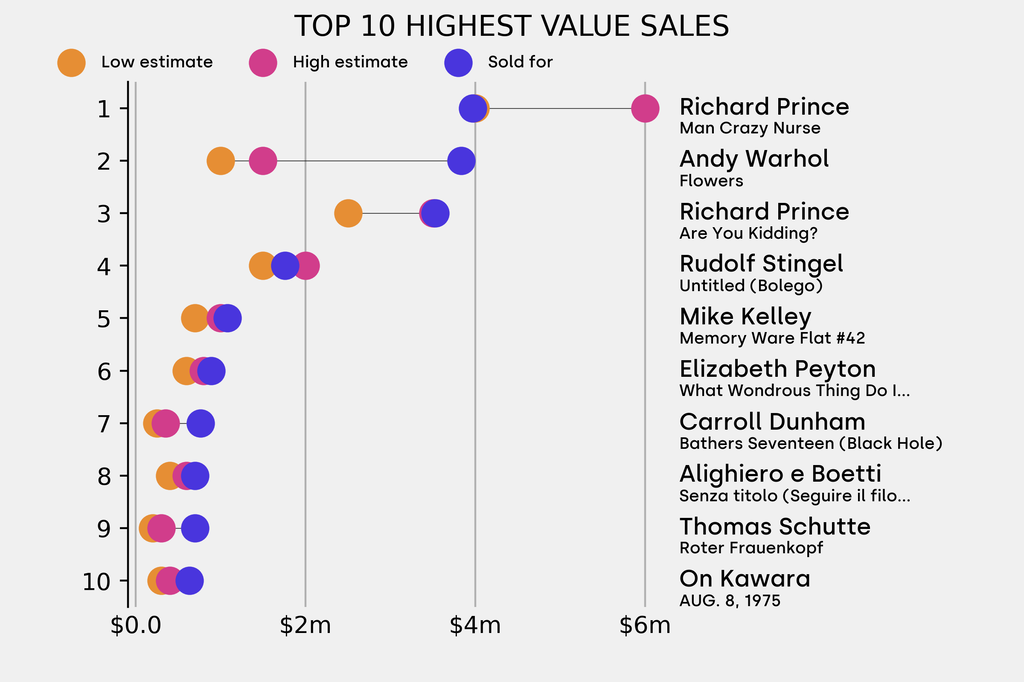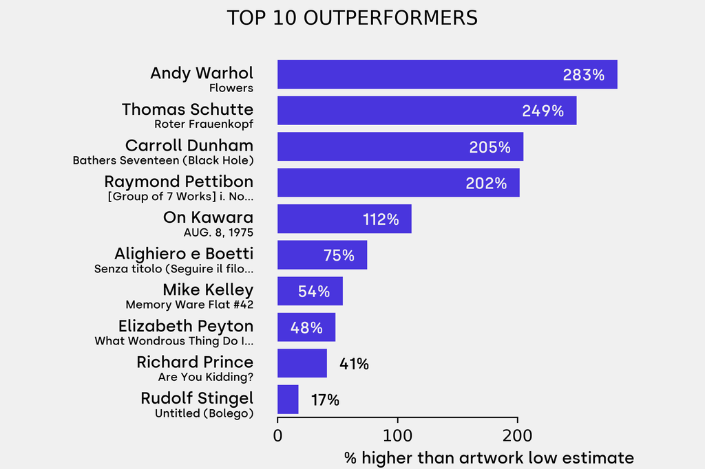 All results include the fees and premiums added to the price of a work of art when the auctioneer's hammer falls. Sale prices are compared to the auction house’s low estimate, which do not include premiums.