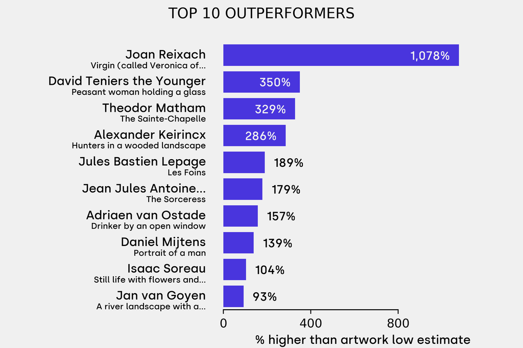 The outperformer sold for 1078% above its low estimate. Joan Reixach, Virgin (called Veronica of the Virgin) (Undated), sold for $79,700 ($6,762 low estimate).