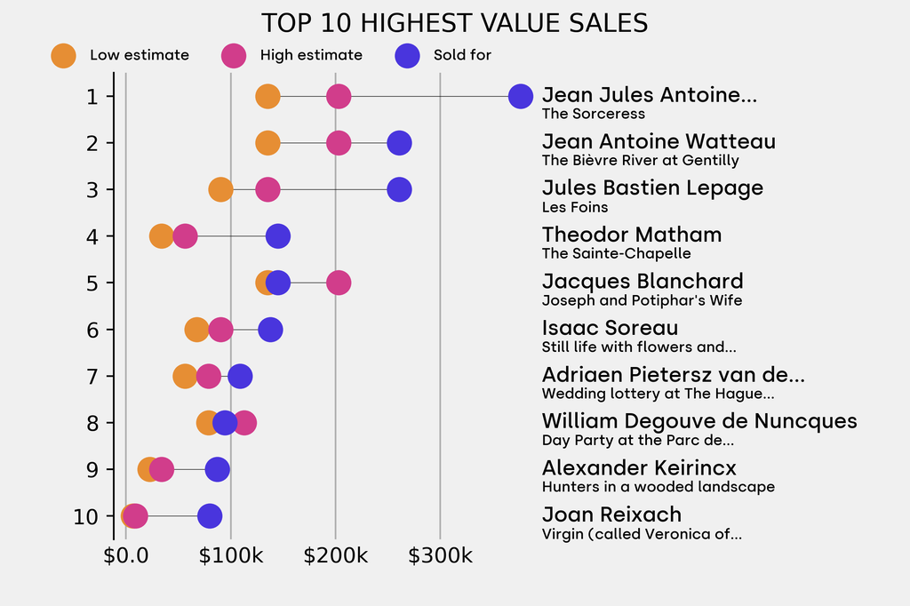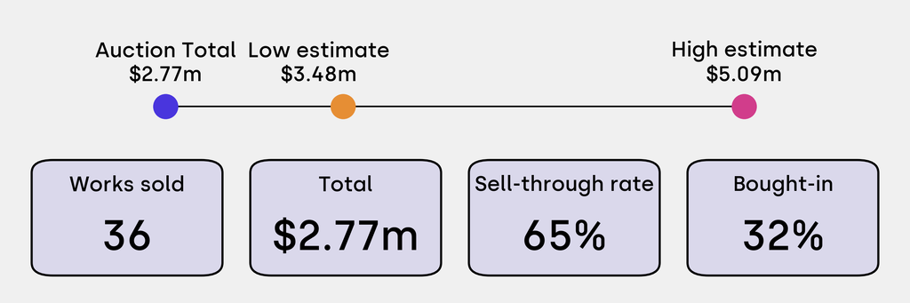 All results include the fees and premiums added to the price of a work of art when the auctioneer's hammer falls. Estimates, sale prices and totals are converted into US dollars. Sale prices are compared to the auction house’s low estimate, which do not include premiums.