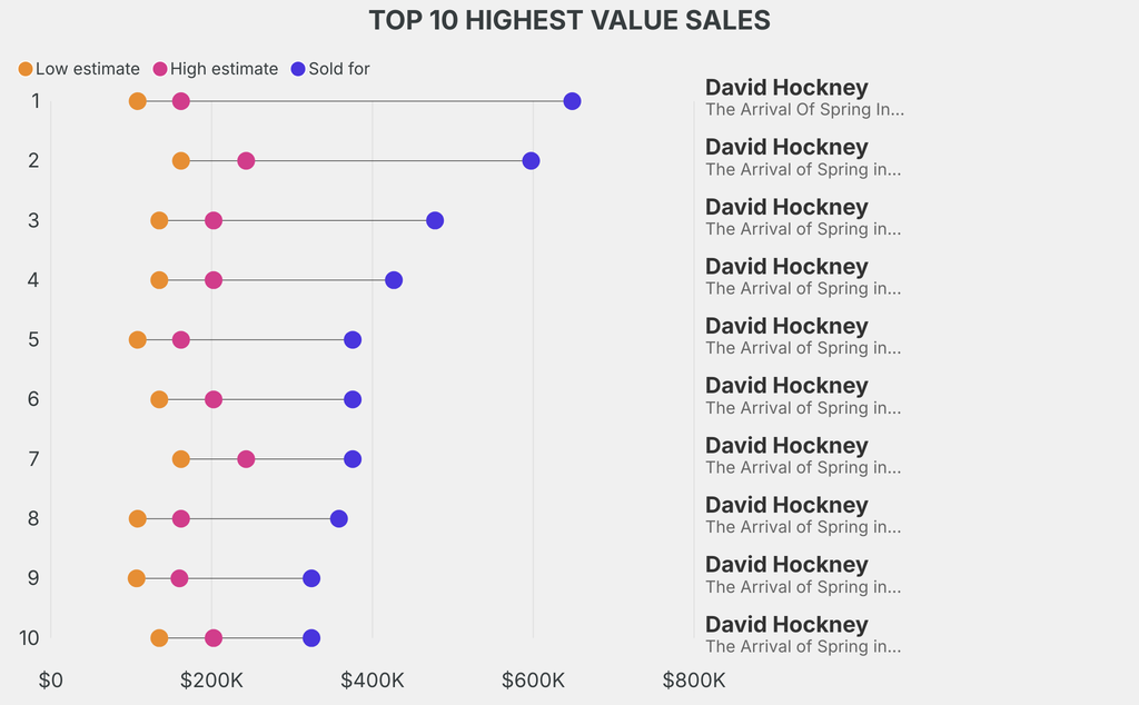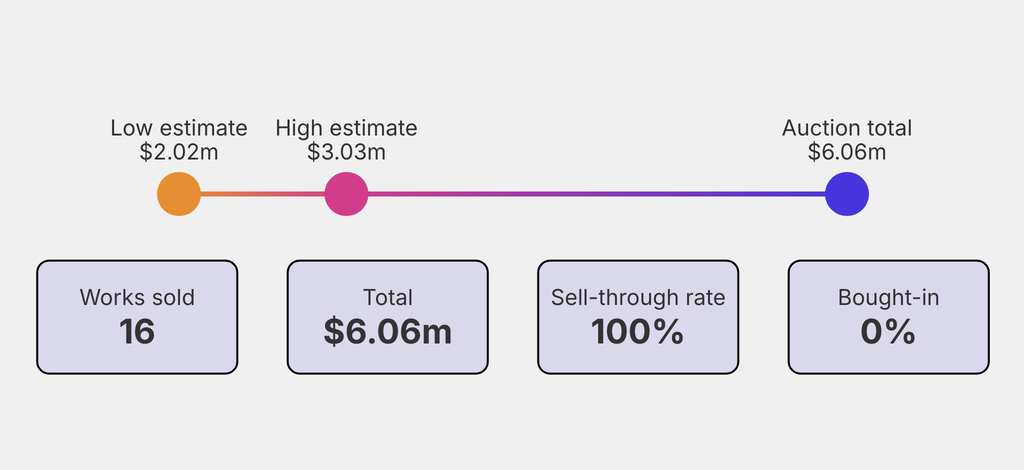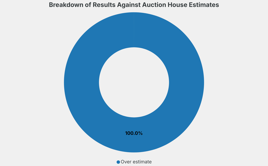 All results include the fees and premiums added to the price of a work of art when the auctioneer's hammer falls. Estimates, sale prices and totals are converted into US dollars. Sale prices are compared to the auction house’s low estimate, which do not include premiums.