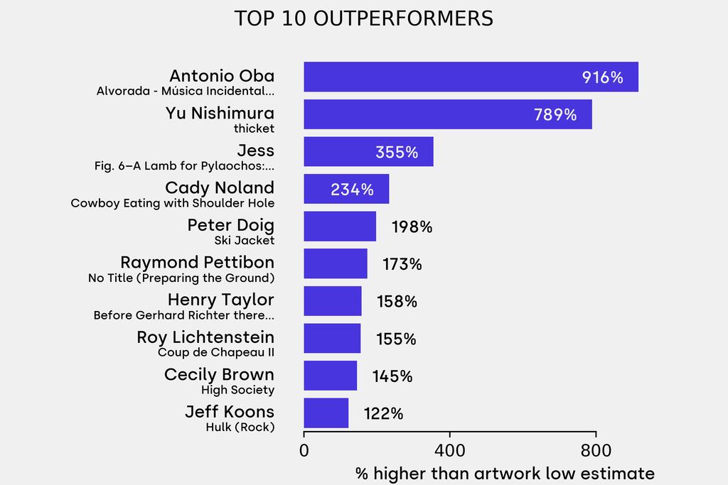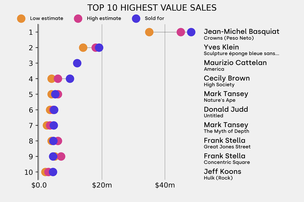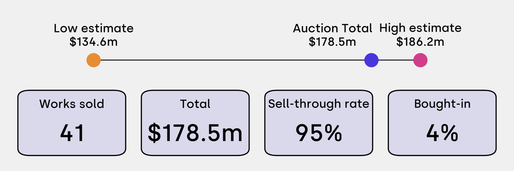 All results include the fees and premiums added to the price of a work of art when the auctioneer's hammer falls. Sale prices are compared to the auction house’s low estimate, which do not include premiums.