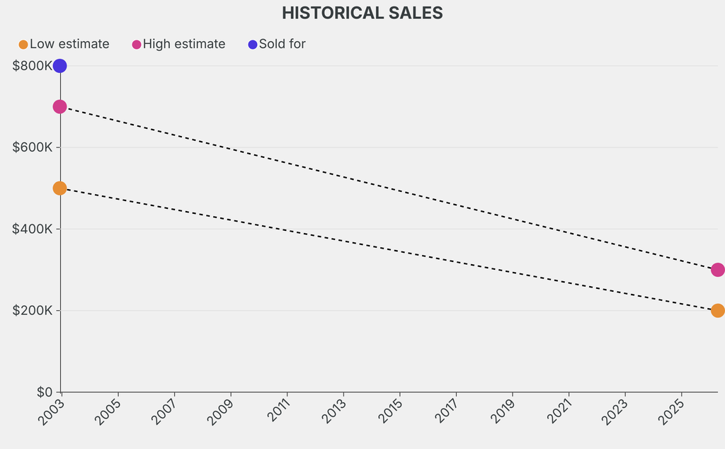 It last sold at auction in 2002 for $800,000 at Christie's. The current low estimate is 60% lower than its previous low estimate of $500,000.