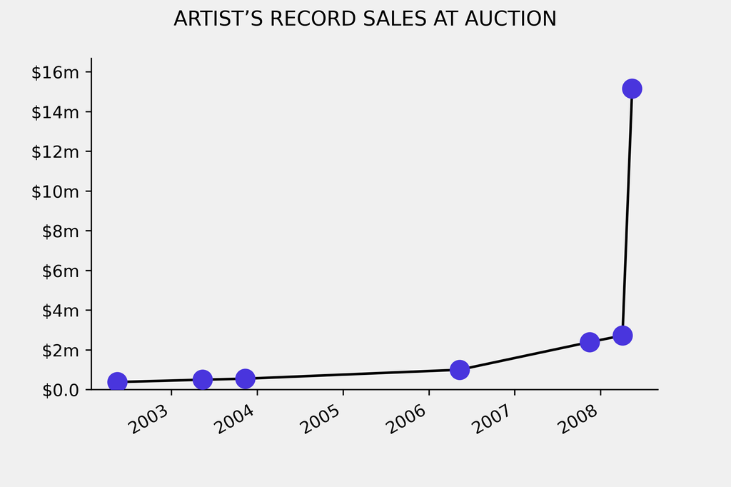 The sale beat the artist’s previous auction record by $12.44m, a 400% rise. His previous record was set by Panda (2003), which sold for $2.72m at Phillips de Pury & Company on April 3, 2008.