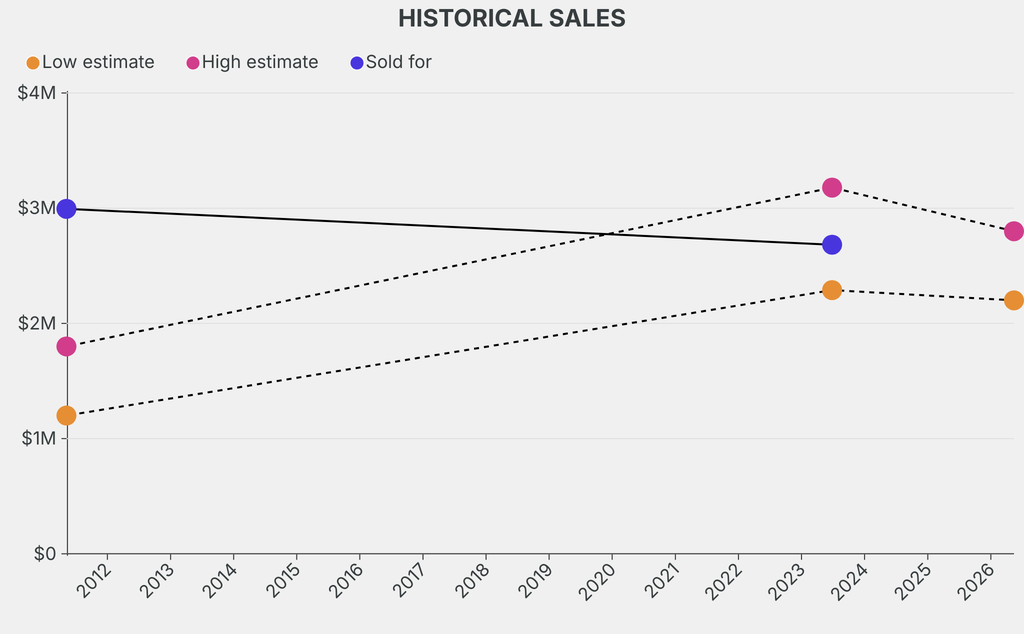 It last sold at auction in 2023 for $2.68m at Sotheby's. The current low estimate is 3% lower than its previous low estimate of $2.29m.