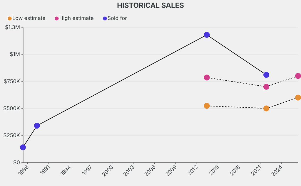 It last sold at auction in 2021 for $810,000 at Christie's. The current low estimate is 19% higher than its previous low estimate of $500,000.