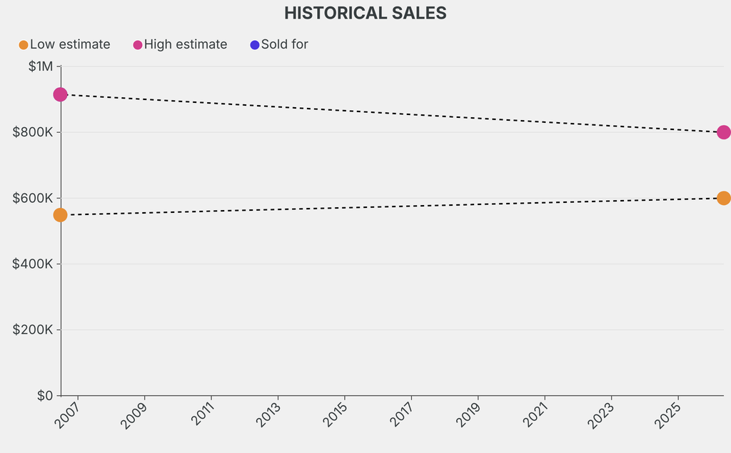 It last sold at auction in 2006 for $914,800 at Christie's. The current low estimate is 9% higher than its previous low estimate of $548,900.