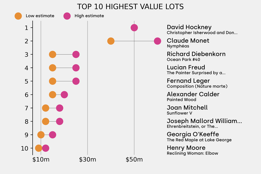 The highest-value lot announced is: David Hockney, Christopher Isherwood and Don Bachardy (1968), which is estimated to sell for between $50m and $50m. The work is backed by a guarantee. It has been traded 5 times in the past.