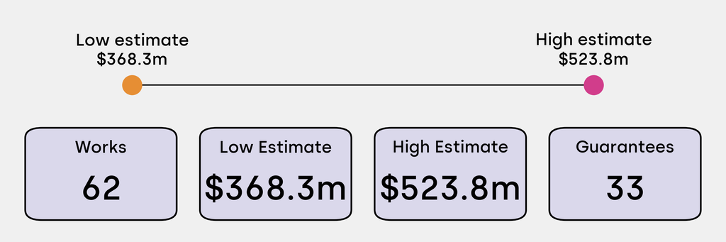 33 works are backed by guarantees, including: Claude Monet, Nymphéas (1907). It is estimated to sell for between $40m and $60m. It has been traded 8 times in the past.