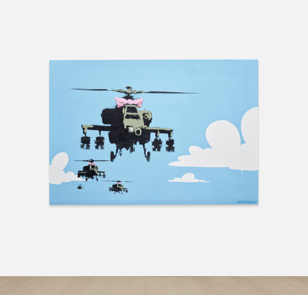 Banksy's Happy Choppers, once owned by actor Robin Williams and his former wife Marsha, sold for its high estimate of $2.09 million including fees.
