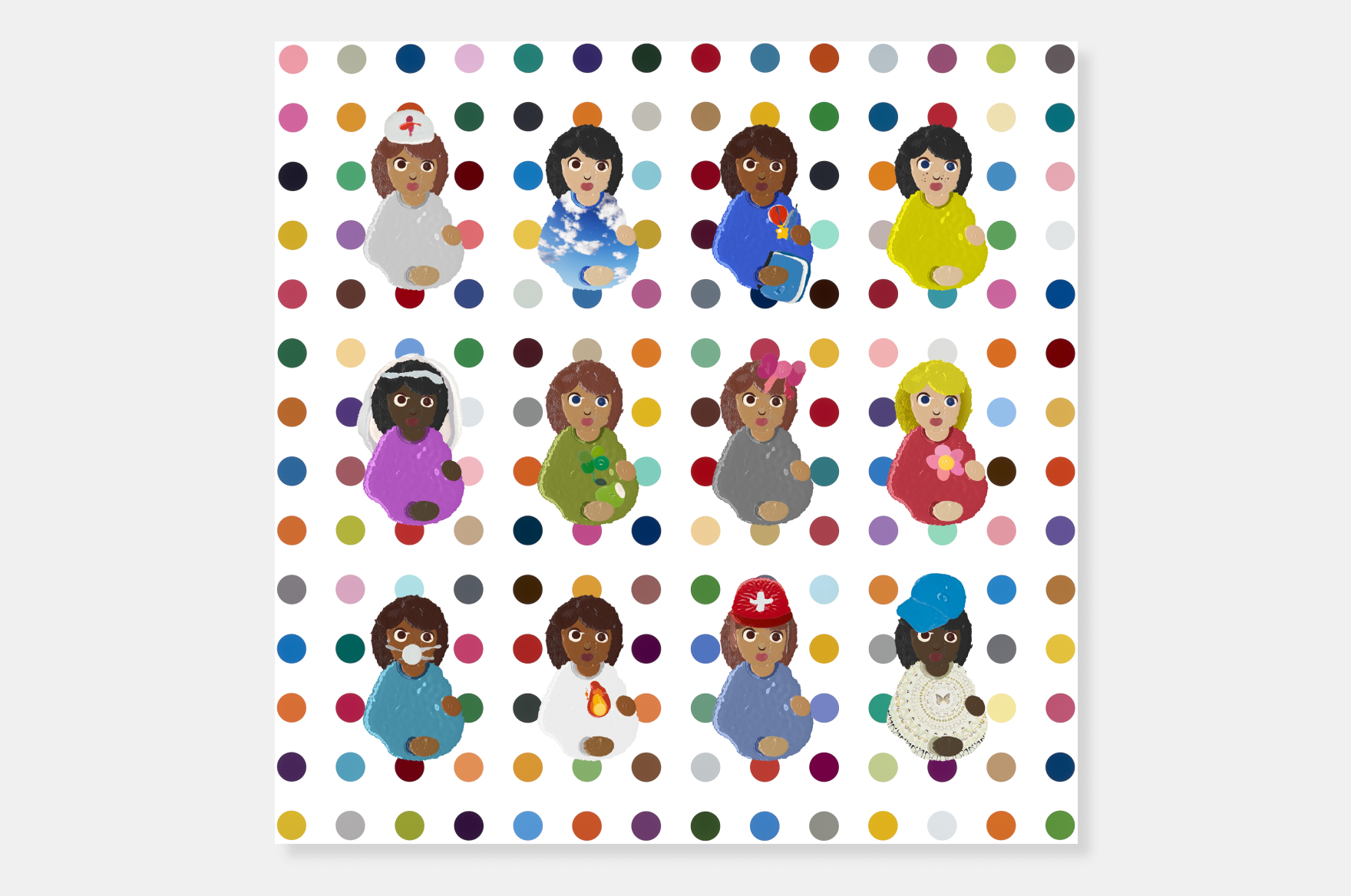 These digitally constructed artworks directly interact with the experimentations at the centre of The Currency. The involvement of The Currency in this project is referenced in the forms of the pregnant women: their physical forms and attributes are composed of spots found in The Currency artworks.