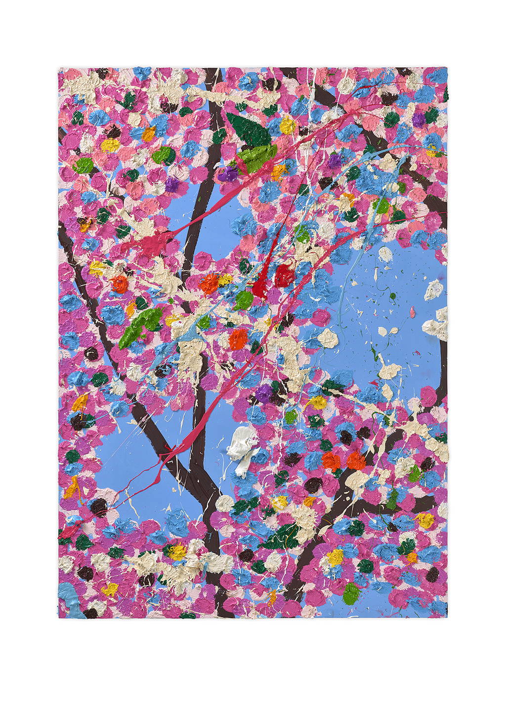 Paper Blossoms is a series of 900 unique original paintings on card featuring the vibrant imagery of Hirst's Cherry Blossoms paintings.