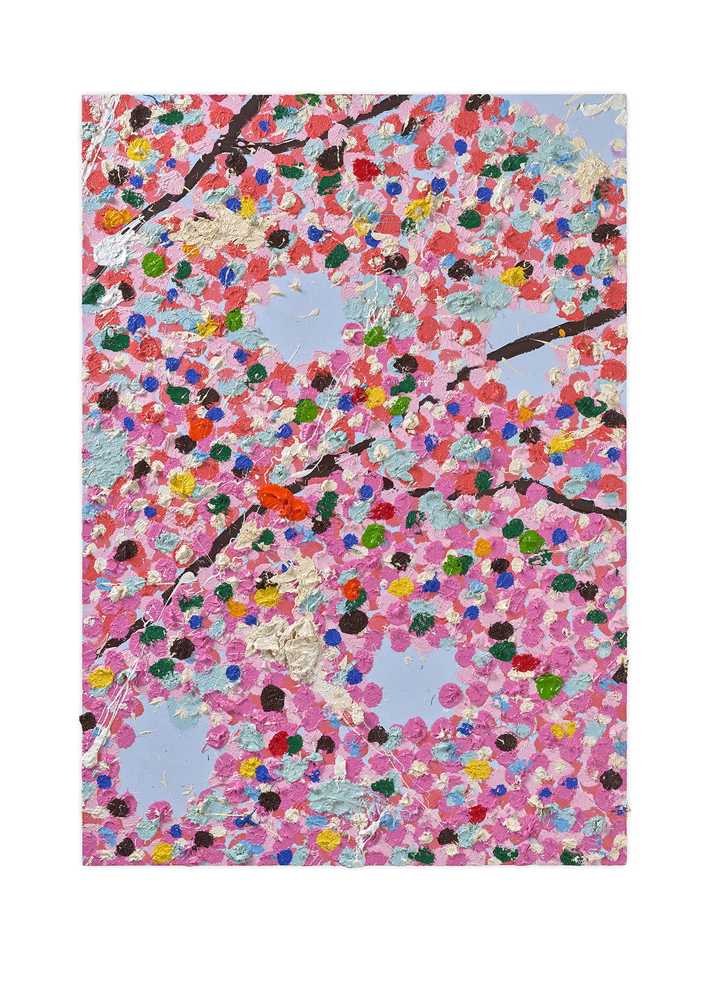 Paper Blossoms is a series of 900 unique original paintings on card featuring the vibrant imagery of Hirst's Cherry Blossoms paintings.