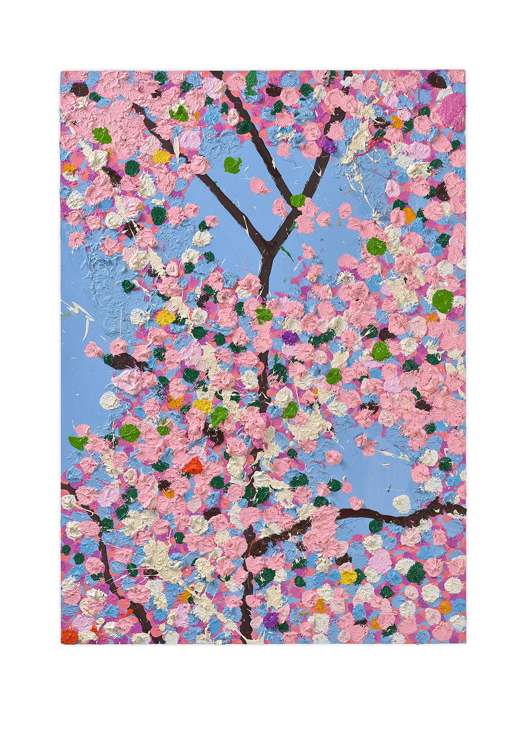 Paper Blossoms is a series of 900 unique original paintings on card featuring the vibrant imagery of Hirst's Cherry Blossoms paintings.