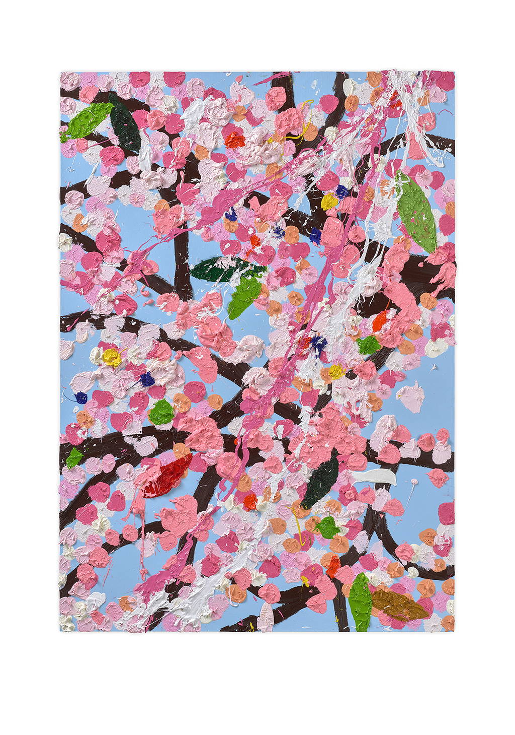 Paper Blossoms is a series of 900 unique original paintings on card featuring the vibrant imagery of Hirst's Cherry Blossoms paintings.