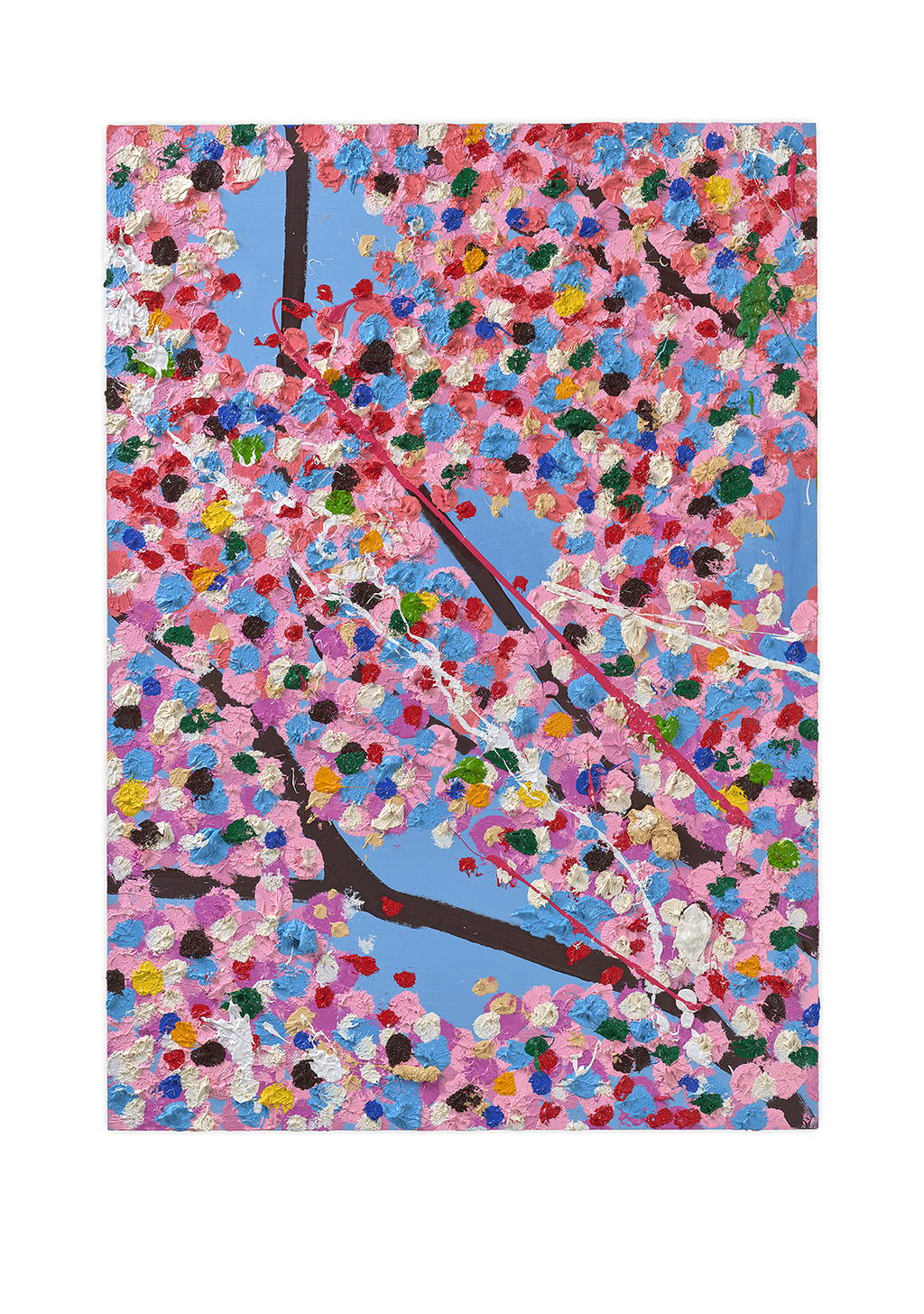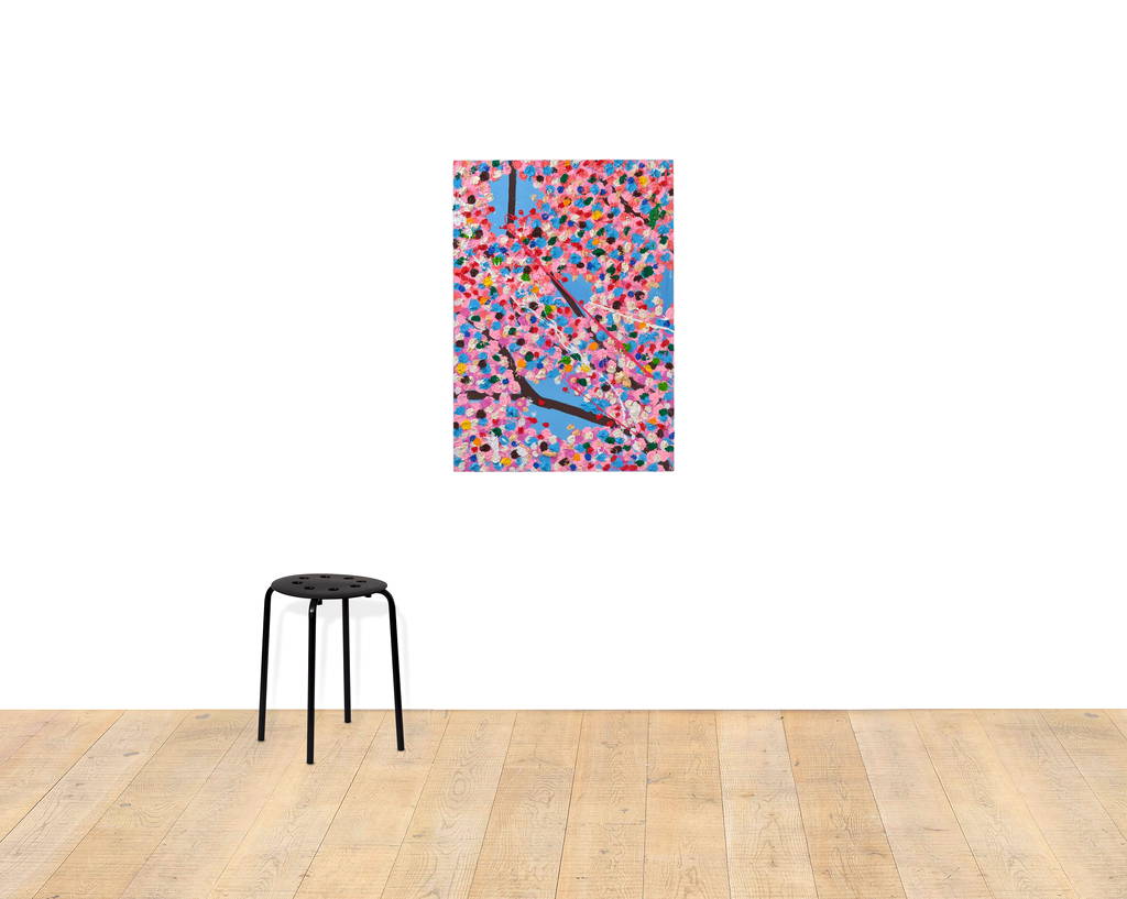 Paper Blossoms is a series of 900 unique original paintings on card featuring the vibrant imagery of Hirst's Cherry Blossoms paintings.