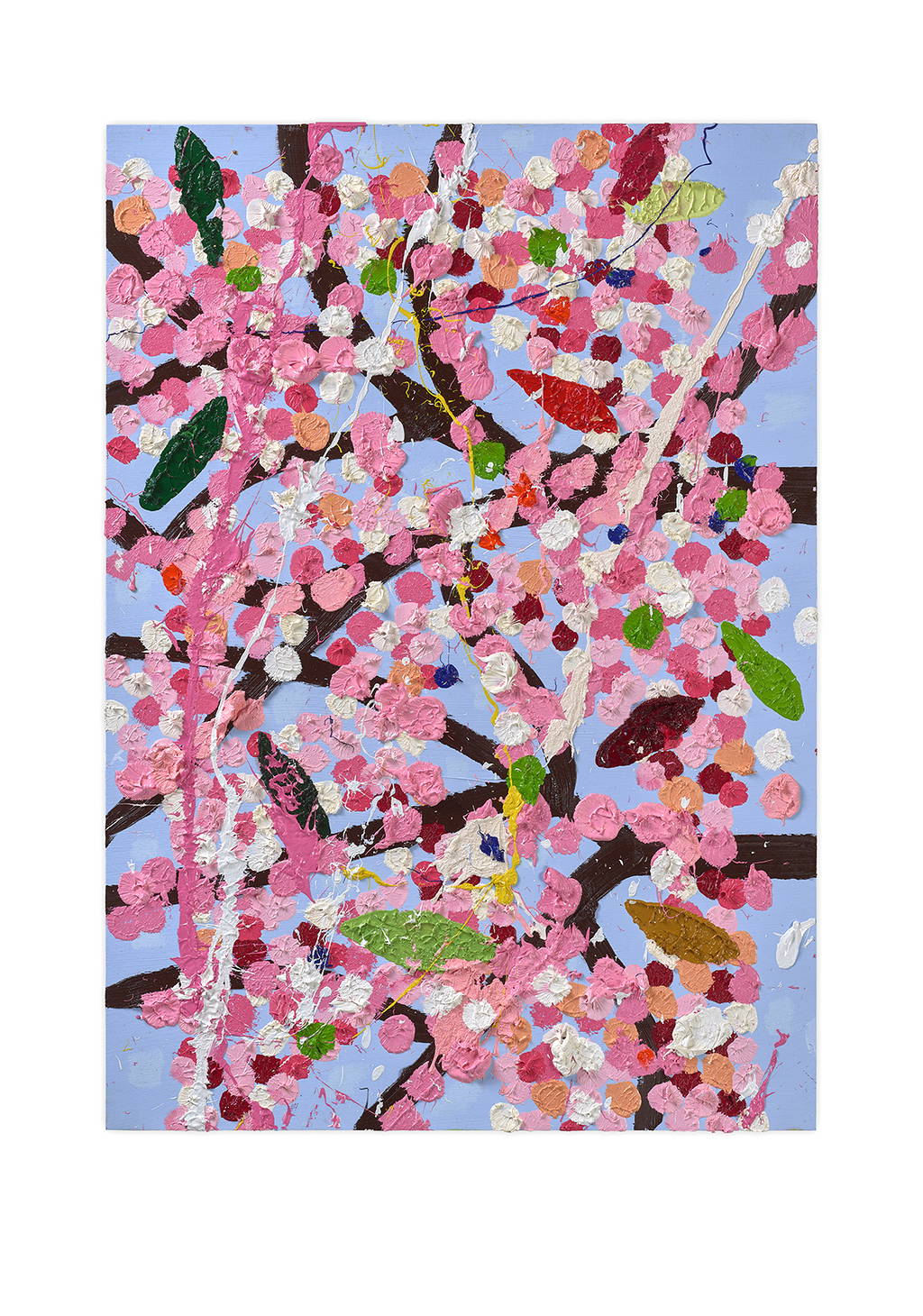 Paper Blossoms is a series of 900 unique original paintings on card featuring the vibrant imagery of Hirst's Cherry Blossoms paintings.