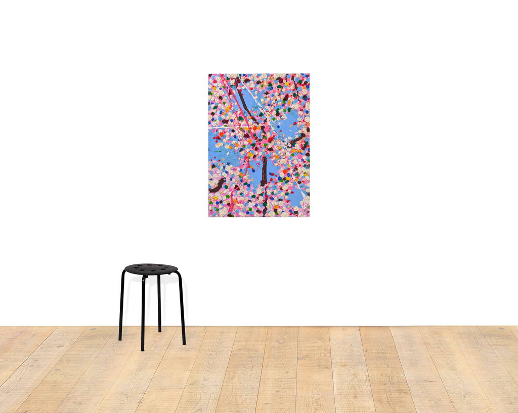 Paper Blossoms is a series of 900 unique original paintings on card featuring the vibrant imagery of Hirst's Cherry Blossoms paintings.