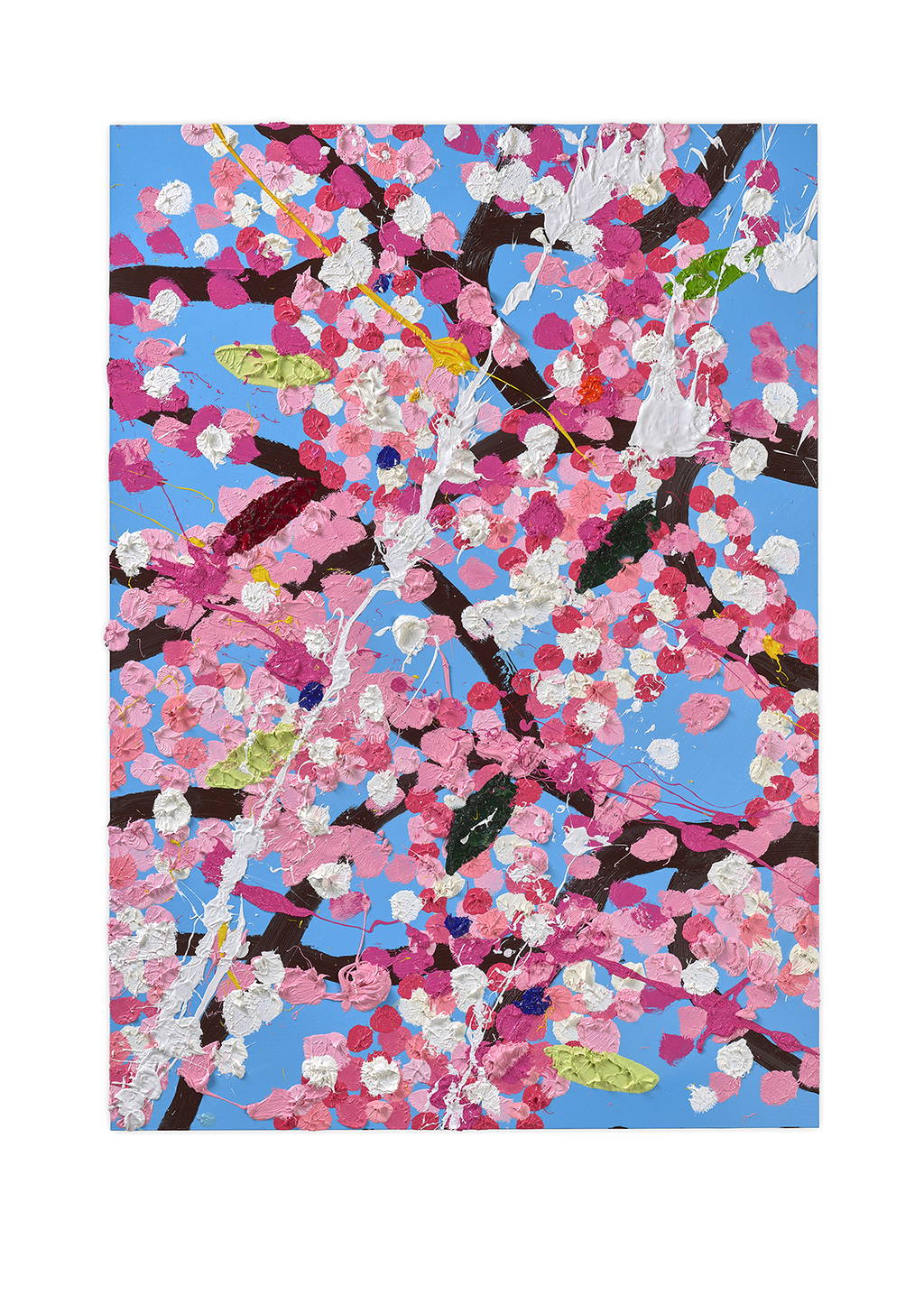 Paper Blossoms is a series of 900 unique original paintings on card featuring the vibrant imagery of Hirst's Cherry Blossoms paintings.