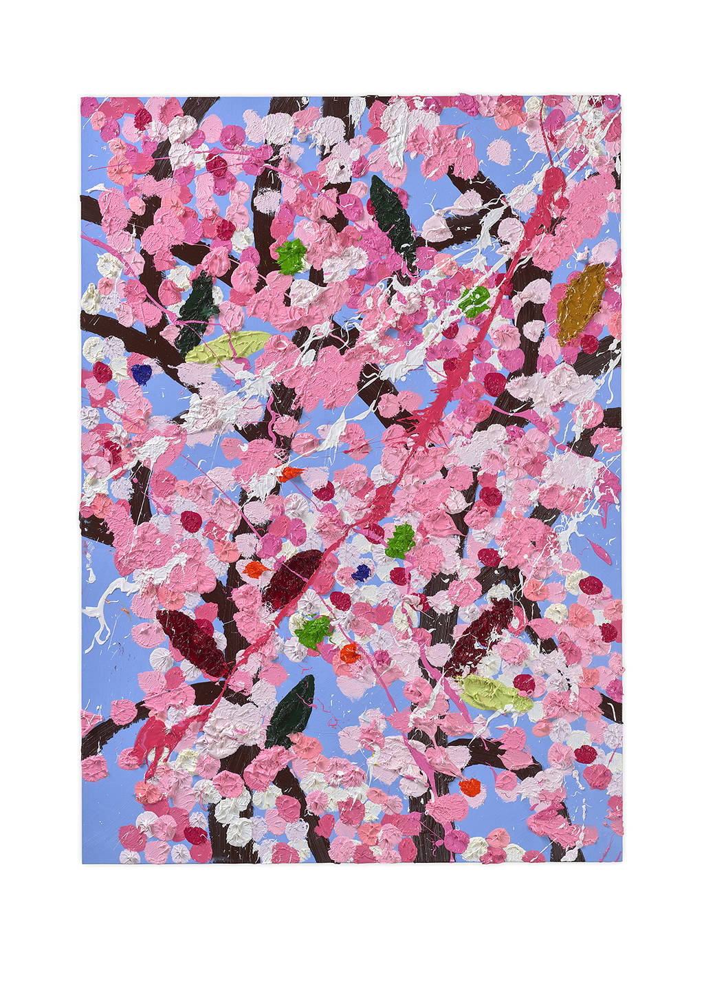 Paper Blossoms is a series of 900 unique original paintings on card featuring the vibrant imagery of Hirst's Cherry Blossoms paintings.