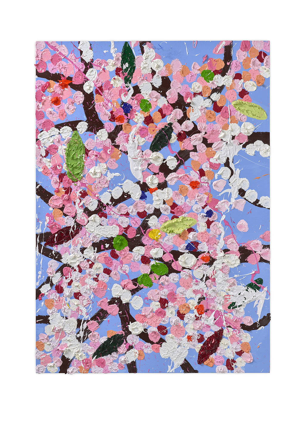 Paper Blossoms is a series of 900 unique original paintings on card featuring the vibrant imagery of Hirst's Cherry Blossoms paintings.