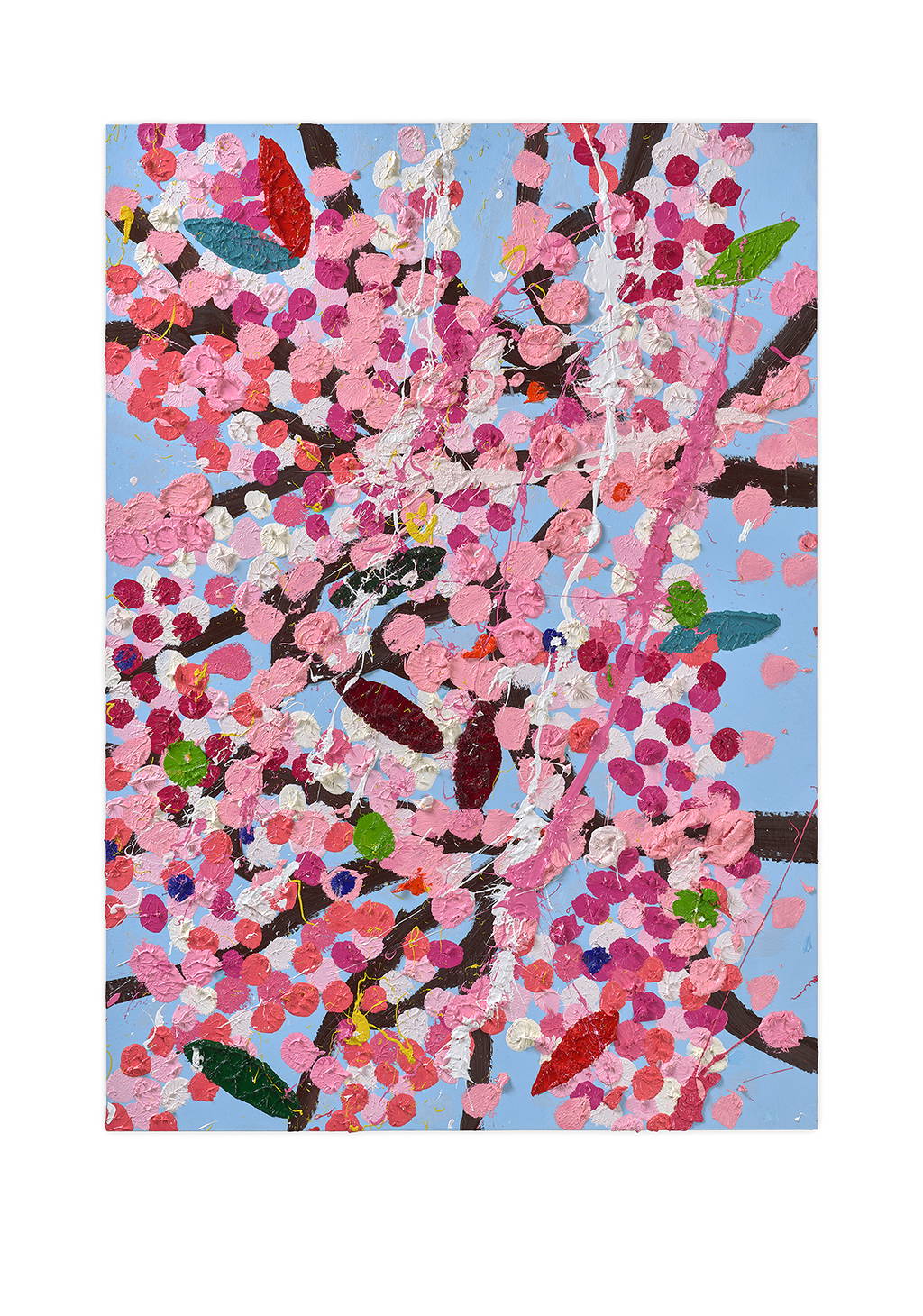Paper Blossoms is a series of 900 unique original paintings on card featuring the vibrant imagery of Hirst's Cherry Blossoms paintings.