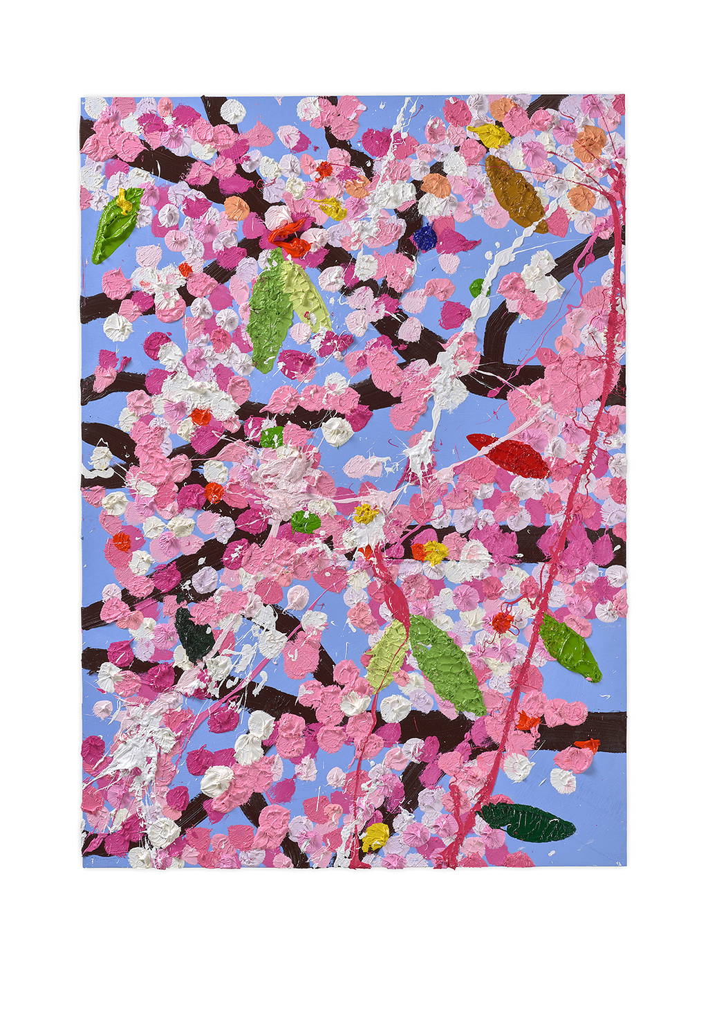 Paper Blossoms is a series of 900 unique original paintings on card featuring the vibrant imagery of Hirst's Cherry Blossoms paintings.
