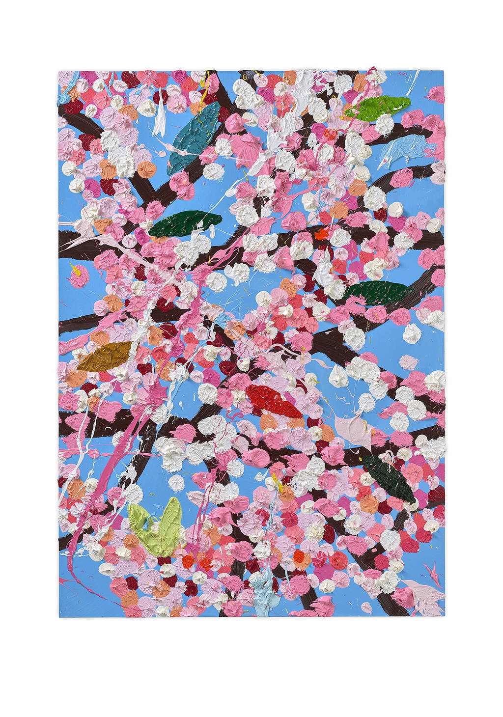 Paper Blossoms is a series of 900 unique original paintings on card featuring the vibrant imagery of Hirst's Cherry Blossoms paintings.