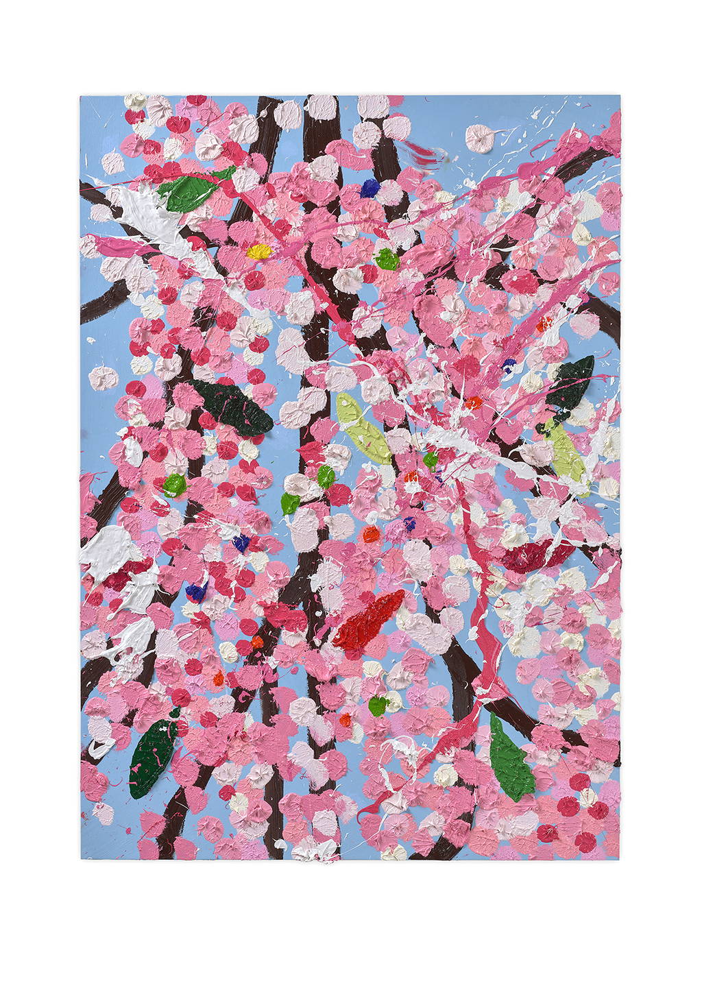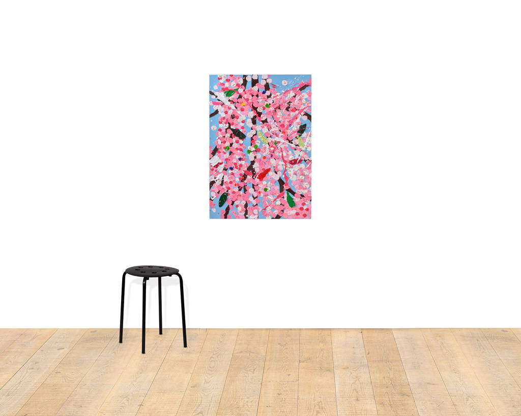 Paper Blossoms is a series of 900 unique original paintings on card featuring the vibrant imagery of Hirst's Cherry Blossoms paintings.