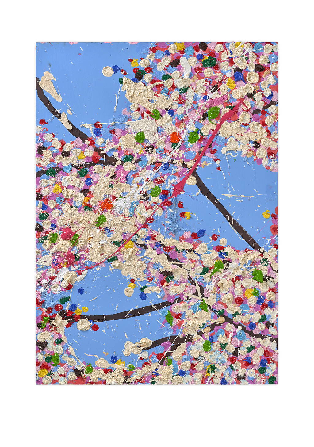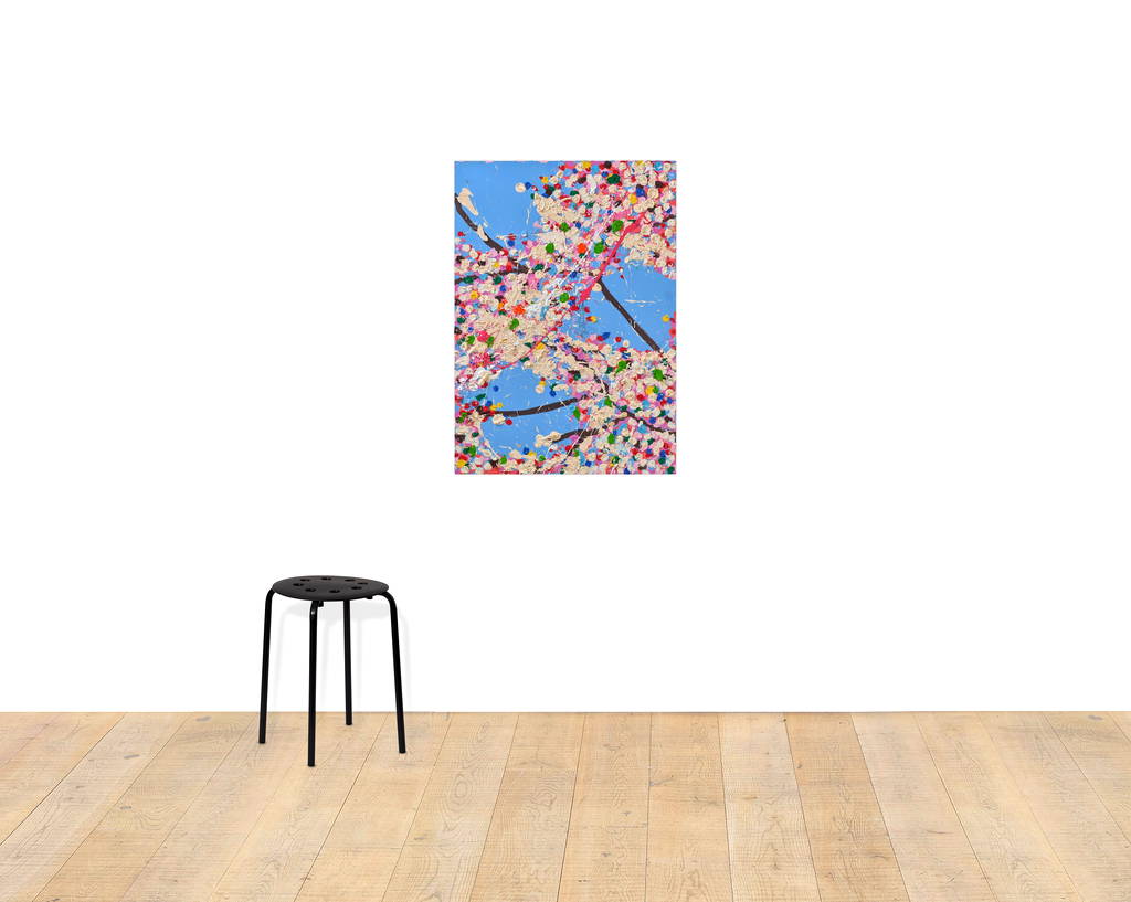 Paper Blossoms is a series of 900 unique original paintings on card featuring the vibrant imagery of Hirst's Cherry Blossoms paintings.