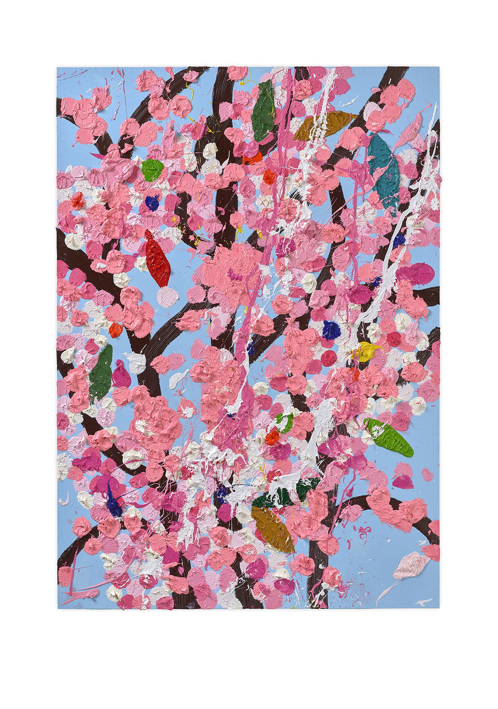 Paper Blossoms is a series of 900 unique original paintings on card featuring the vibrant imagery of Hirst's Cherry Blossoms paintings.
