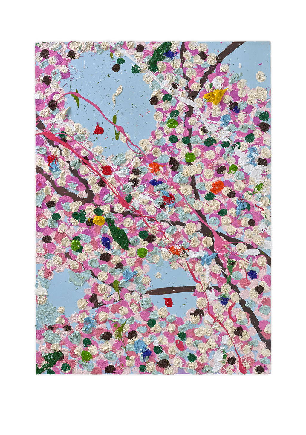Paper Blossoms is a series of 900 unique original paintings on card featuring the vibrant imagery of Hirst's Cherry Blossoms paintings.