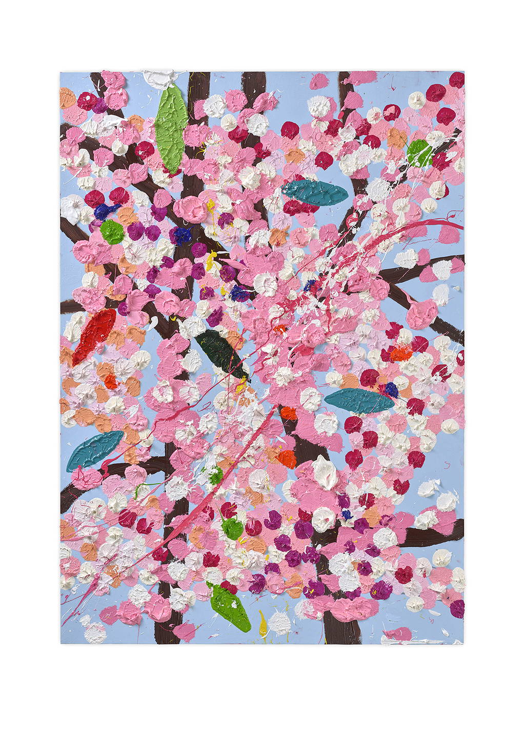 Paper Blossoms is a series of 900 unique original paintings on card featuring the vibrant imagery of Hirst's Cherry Blossoms paintings.