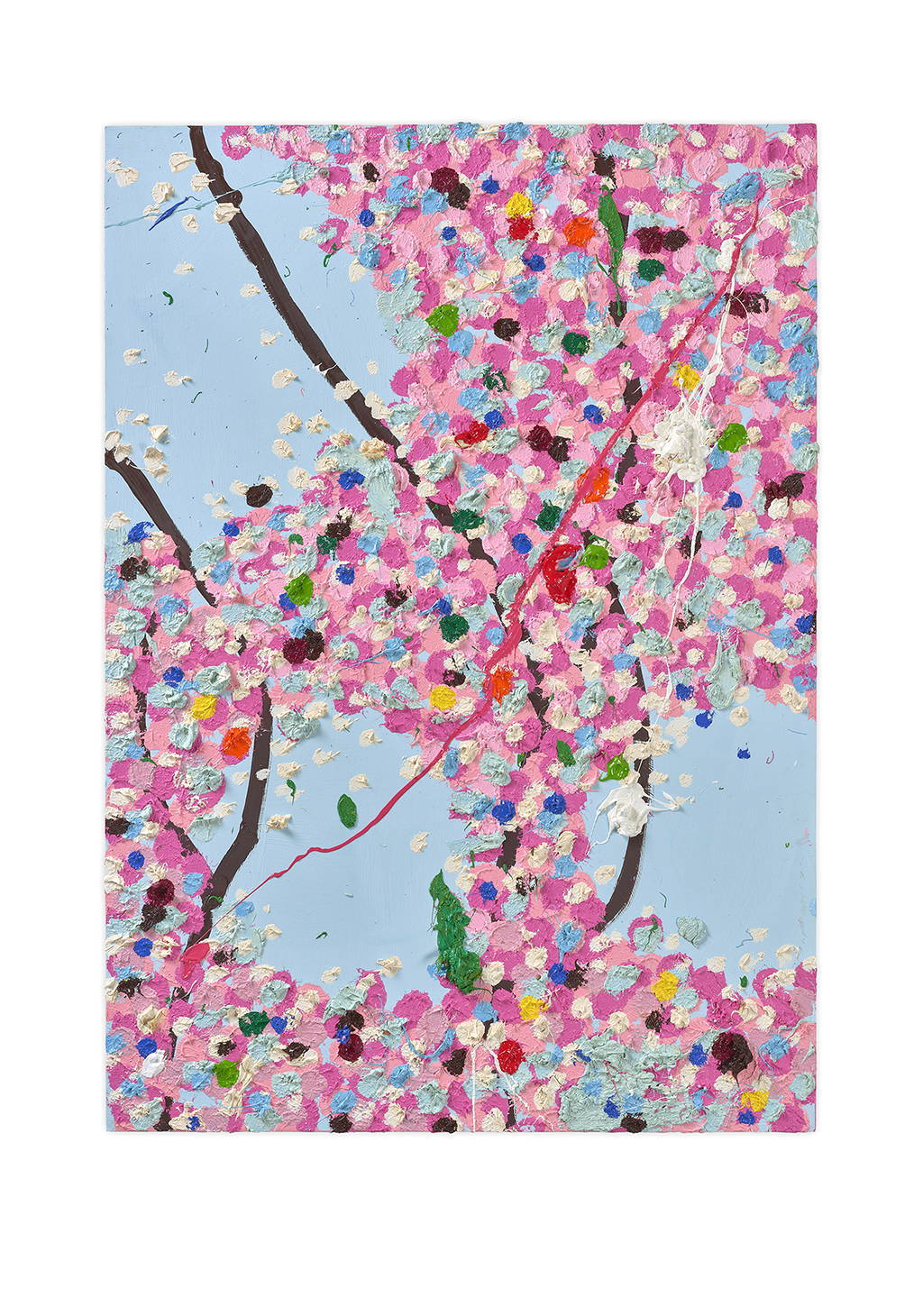 Paper Blossoms is a series of 900 unique original paintings on card featuring the vibrant imagery of Hirst's Cherry Blossoms paintings.