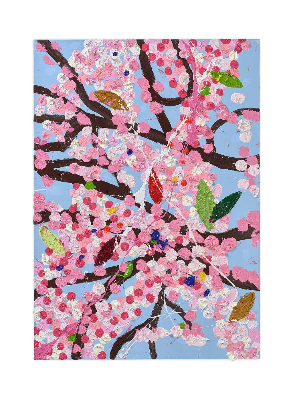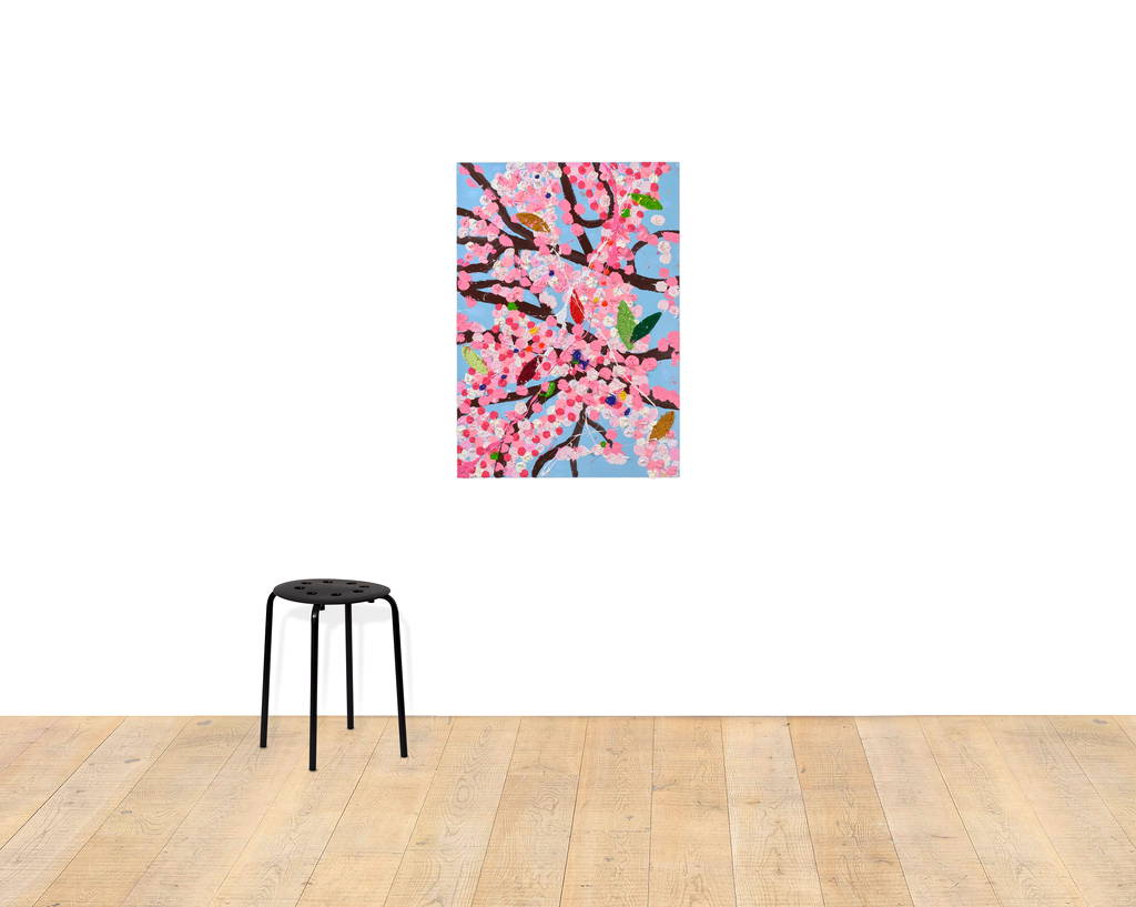 Paper Blossoms is a series of 900 unique original paintings on card featuring the vibrant imagery of Hirst's Cherry Blossoms paintings.