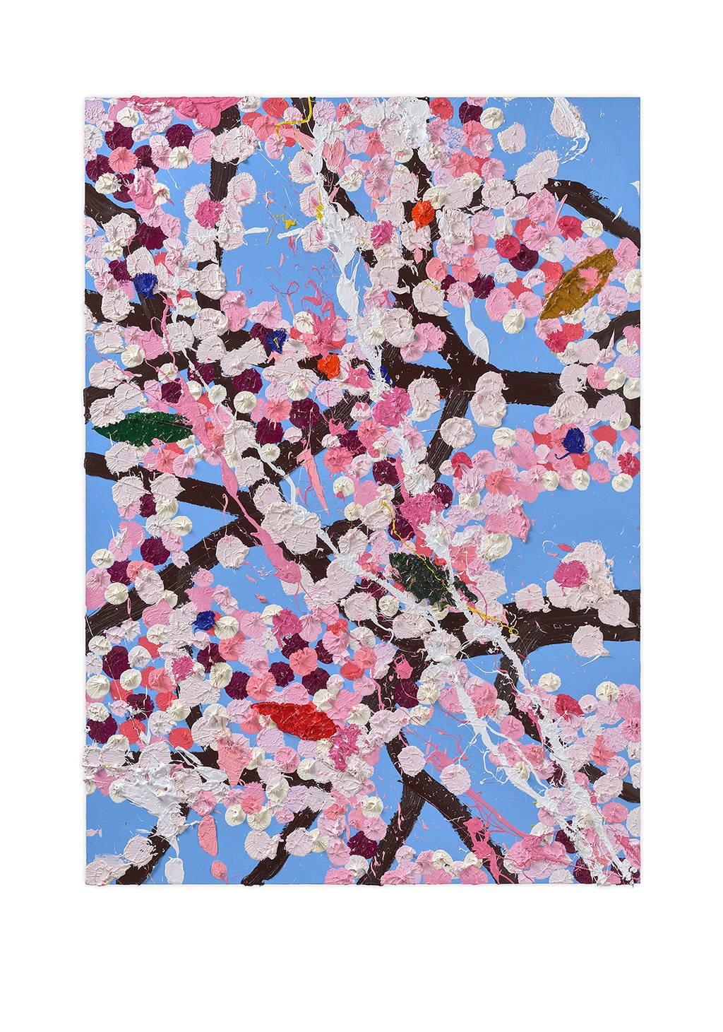 Paper Blossoms is a series of 900 unique original paintings on card featuring the vibrant imagery of Hirst's Cherry Blossoms paintings.