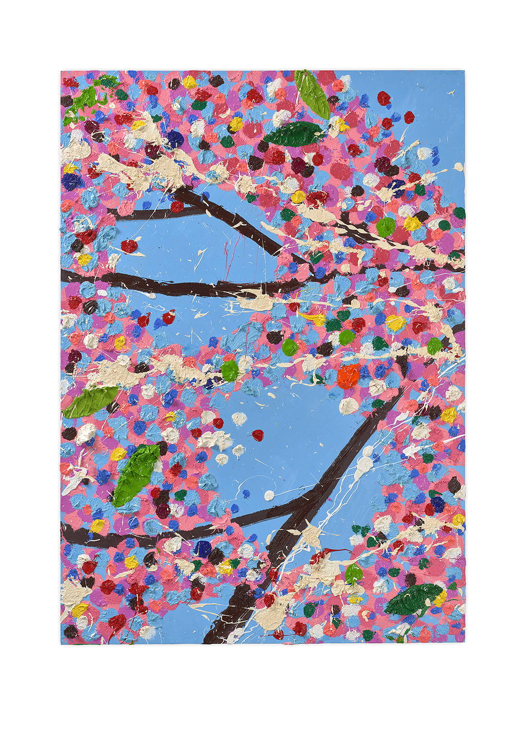 Paper Blossoms is a series of 900 unique original paintings on card featuring the vibrant imagery of Hirst's Cherry Blossoms paintings.