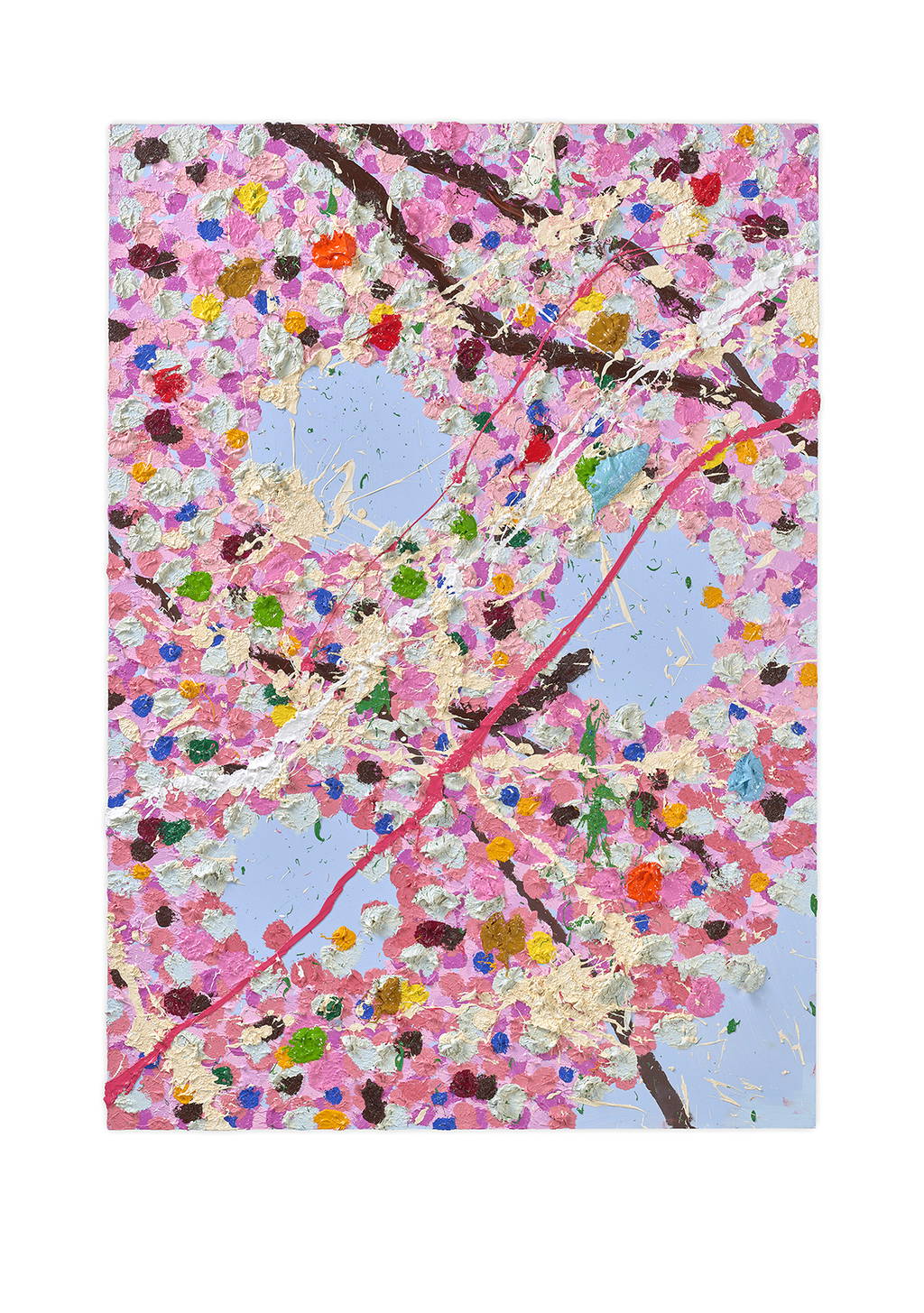 Paper Blossoms is a series of 900 unique original paintings on card featuring the vibrant imagery of Hirst's Cherry Blossoms paintings.