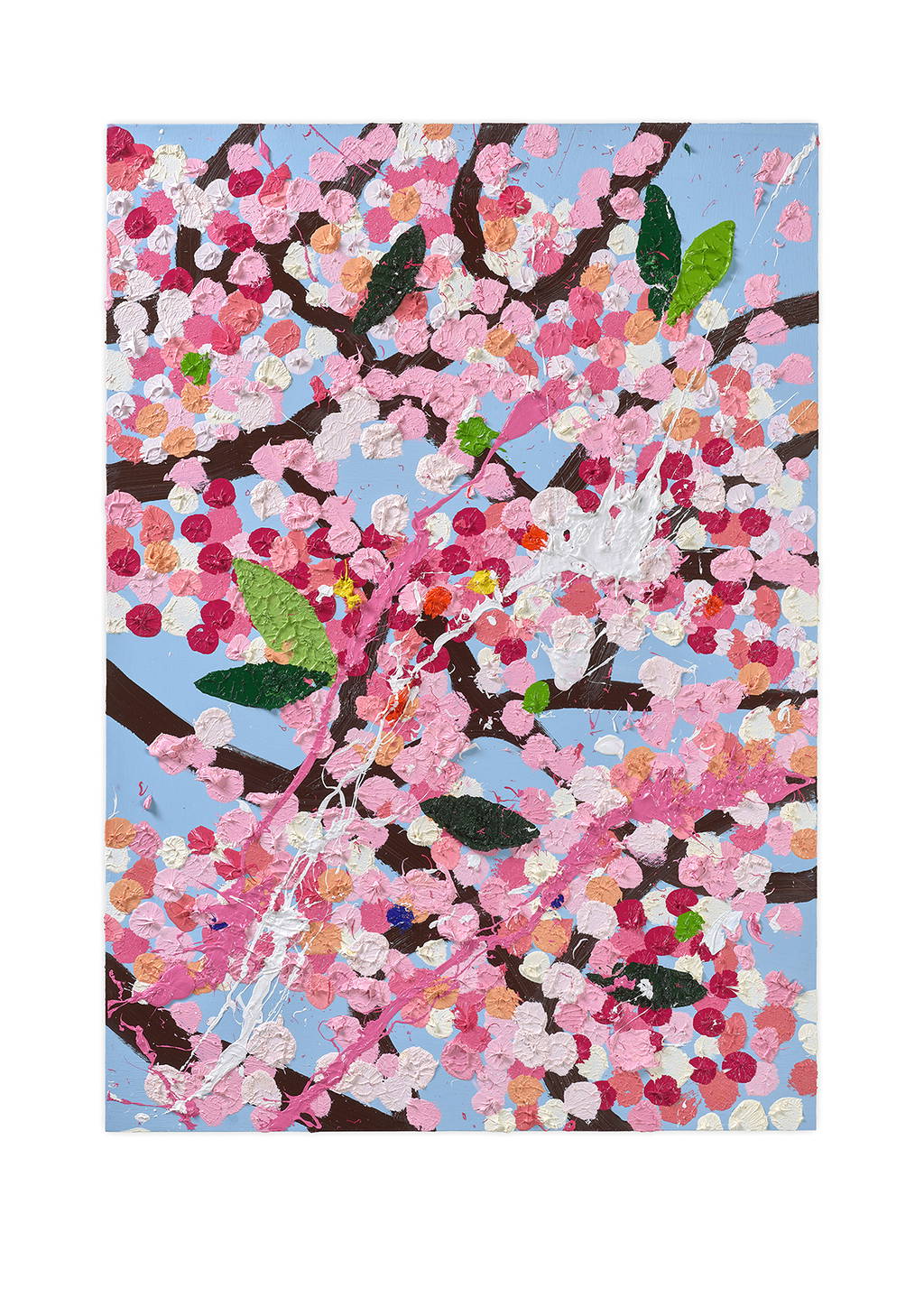 Paper Blossoms is a series of 900 unique original paintings on card featuring the vibrant imagery of Hirst's Cherry Blossoms paintings.