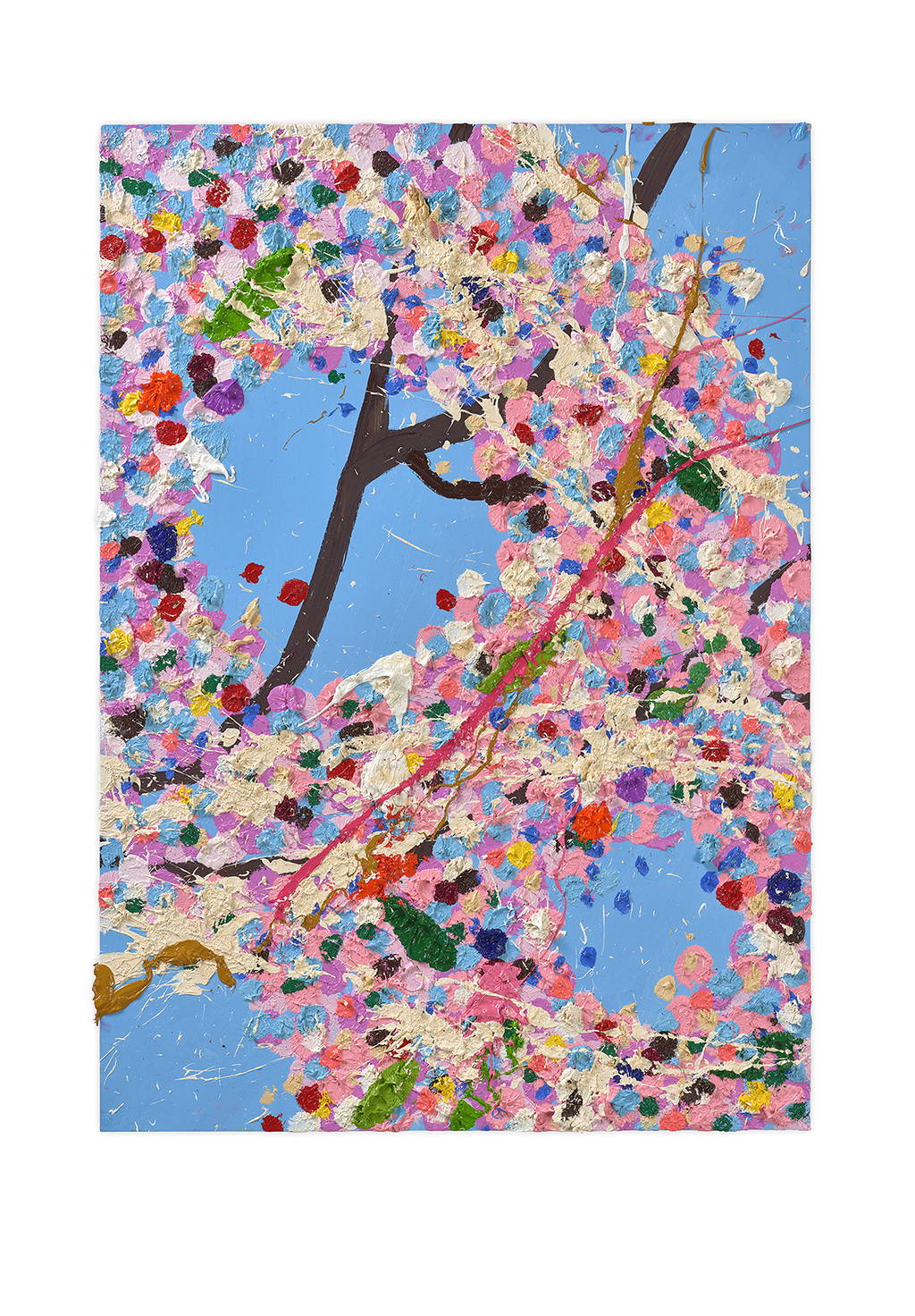 Paper Blossoms is a series of 900 unique original paintings on card featuring the vibrant imagery of Hirst's Cherry Blossoms paintings.
