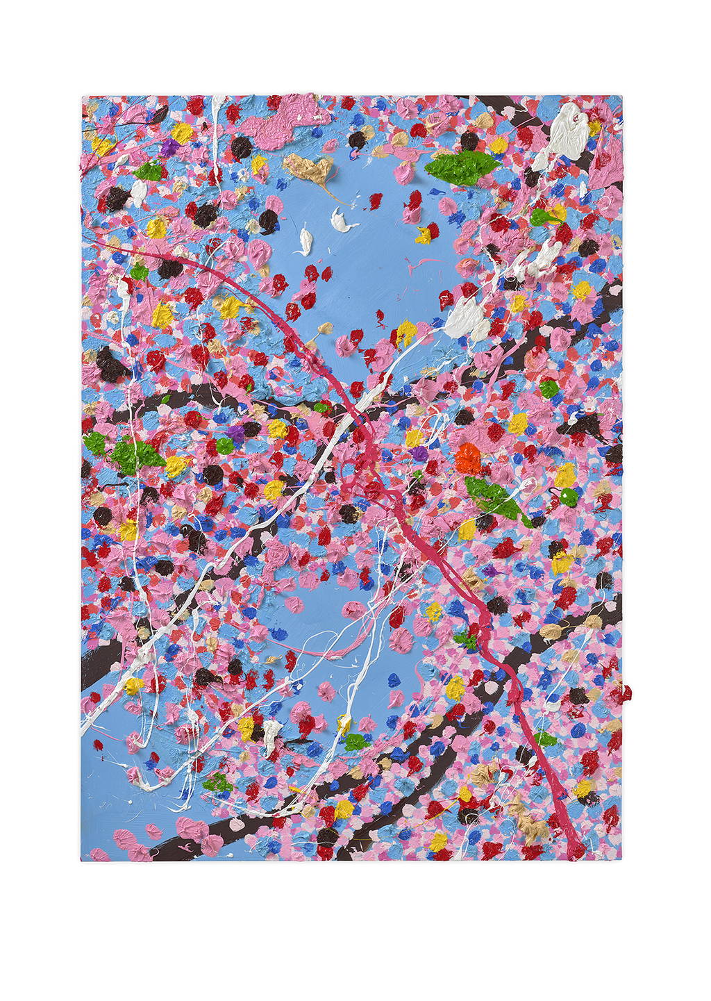 Paper Blossoms is a series of 900 unique original paintings on card featuring the vibrant imagery of Hirst's Cherry Blossoms paintings.