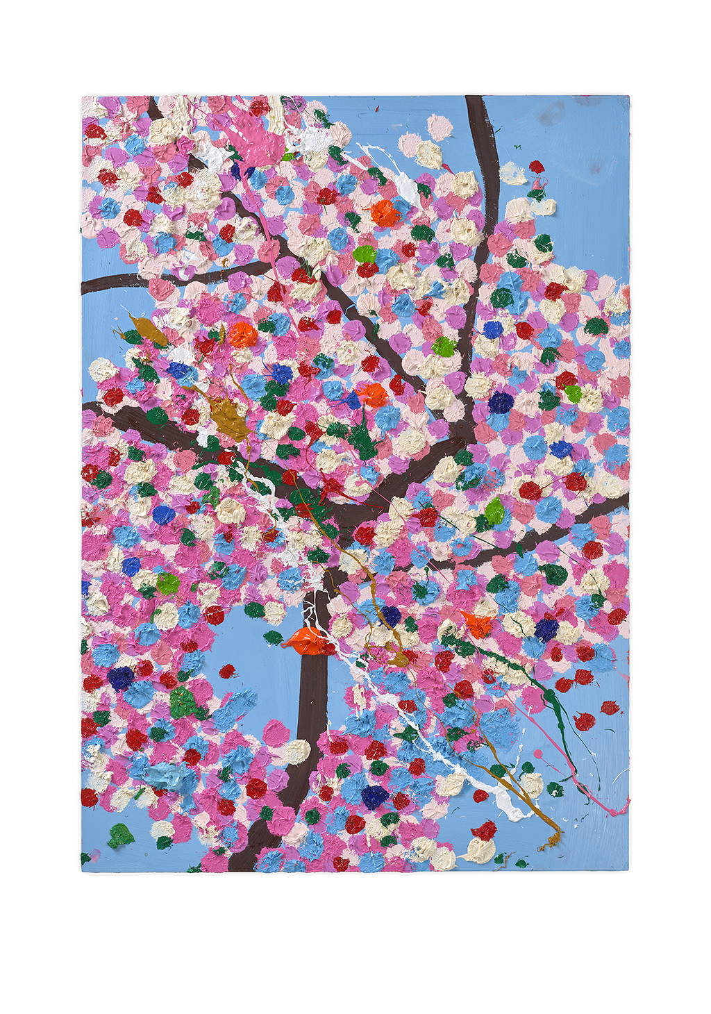 Paper Blossoms is a series of 900 unique original paintings on card featuring the vibrant imagery of Hirst's Cherry Blossoms paintings.