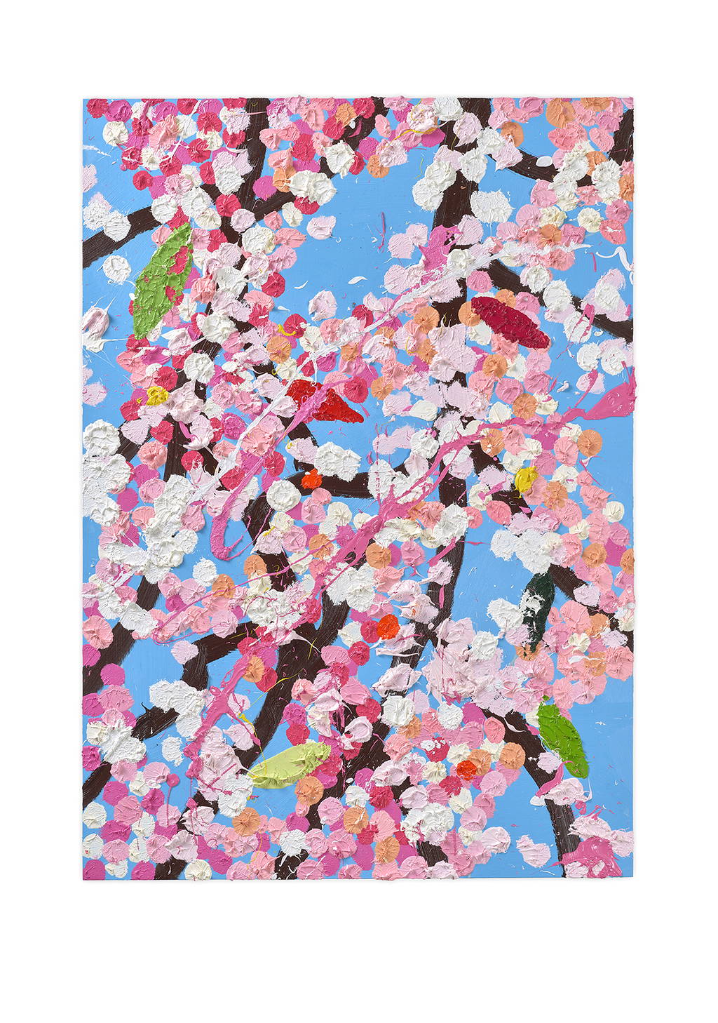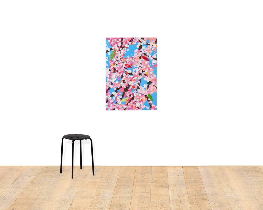 Paper Blossoms is a series of 900 unique original paintings on card featuring the vibrant imagery of Hirst's Cherry Blossoms paintings.