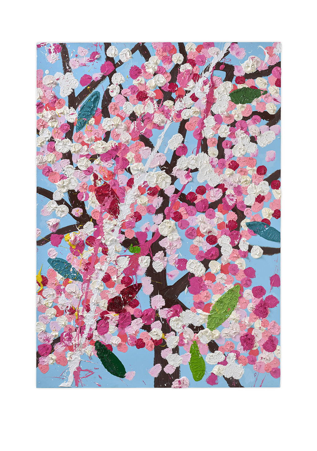 Paper Blossoms is a series of 900 unique original paintings on card featuring the vibrant imagery of Hirst's Cherry Blossoms paintings.